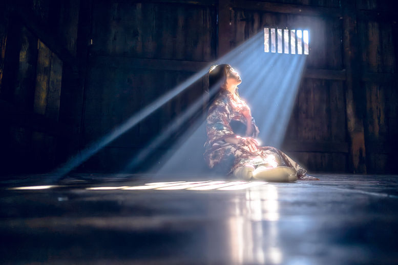 A moment of rebirth beneath a silent beam of light.In darkness, grace descends.
